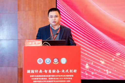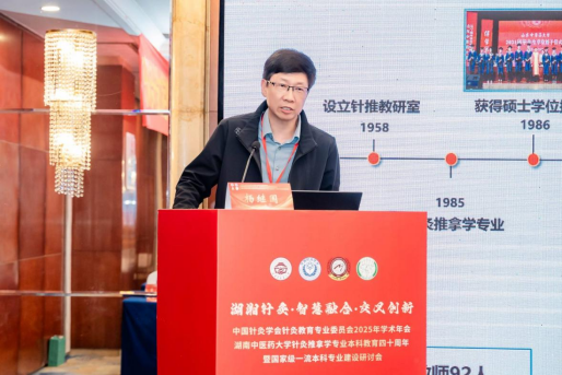 湖南省中医药管理局科技教育处副处长侯漫军致辞。他指出,针灸推拿专业作为中医药人才培养的重要领域,肩负着中医药传承创新发展的重要任务。他强调,要以此次会议为契机,深入贯彻落实党的二十届四中全会精神,进一步加强针灸推拿专业人才的培养。
