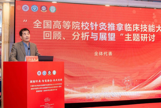 在沈雪勇教授的主持下,大会进入“全国高等院校针灸推拿临床技能大赛回顾、分析与展望”主题研讨环节。沈教授回顾了该项赛事自2010年创办至今,十五年的发展,已成为行业内的“至高赛事”。为推动赛事持续优化,他诚挚邀请与会教师、领队、教练及参赛选手踊跃建言。研讨中,湖南中医药大学专业针灸学教研室主任杨茜芸结合自身带队经验,提出三项具体建议:明确各环节操作与准备时间、利用信息化手段及时公示成绩、引入3D点穴模型使考核更直观客观。现场交流热烈,同仁们纷纷各抒己见,为提升大赛质量与效率凝聚了广泛智慧。最后,沈雪勇教授总结表示,将认真研究吸纳各项合理建议,力求将可行的方案落到实处,共同促进大赛越办越好。