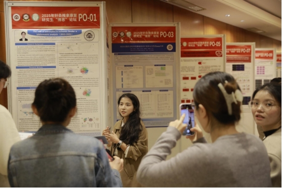 茶歇时间, 研究生墙报交流在学术报告厅前厅热烈开展,18份精选墙报涵盖了bibliometric分析、meta分析、基础实验研究、理论探讨、临床应用等多种研究类型,内容包括缺血性脑卒中、支气管哮喘、慢性非特异性腰痛、胃癌、带状疱疹等多个领域,为研究生提供了多元化的学术交流平台,激发了同学们的学术热情。